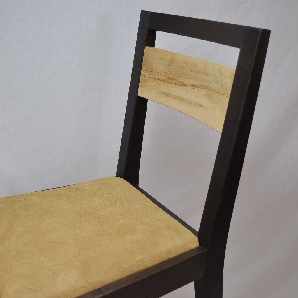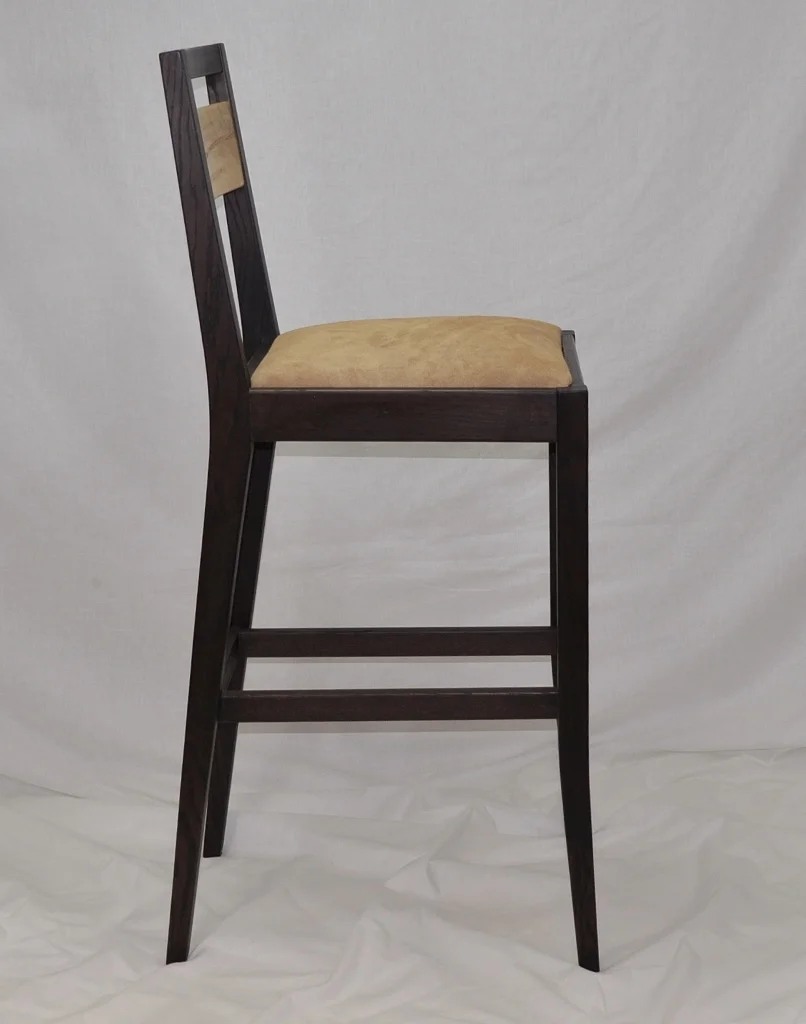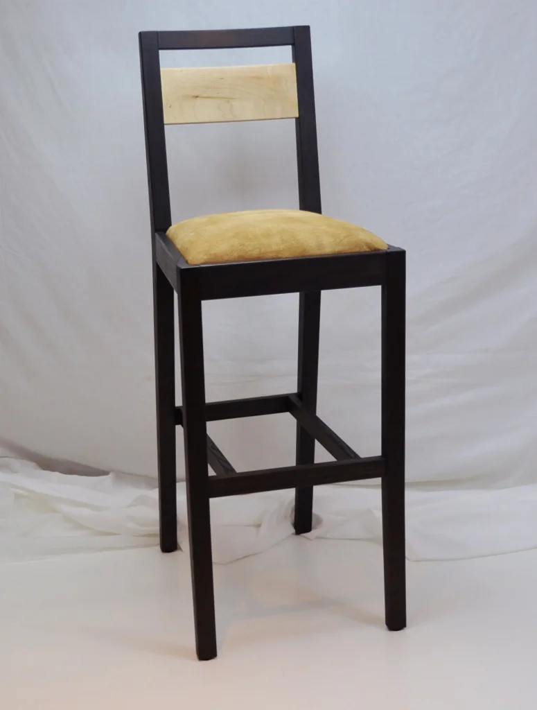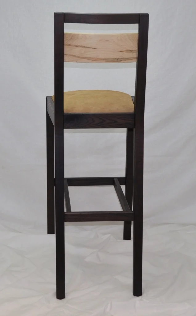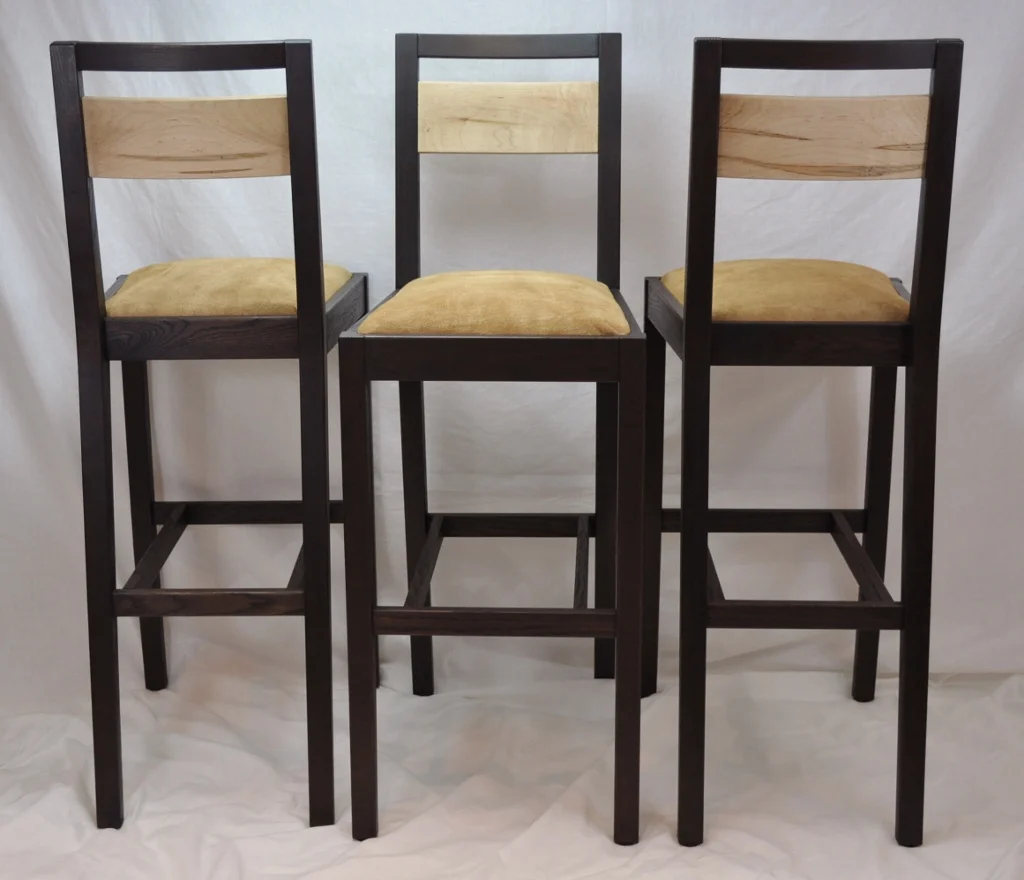 Pictured in maple with a dark walnut dye, ambrosia maple backrest, and suede seat with memory foam cushion. These bar stools were a special commission designed to match ambrosia maple accents in the client’s kitchen area. The suede covered memory foam seats are exceptionally comfortable.